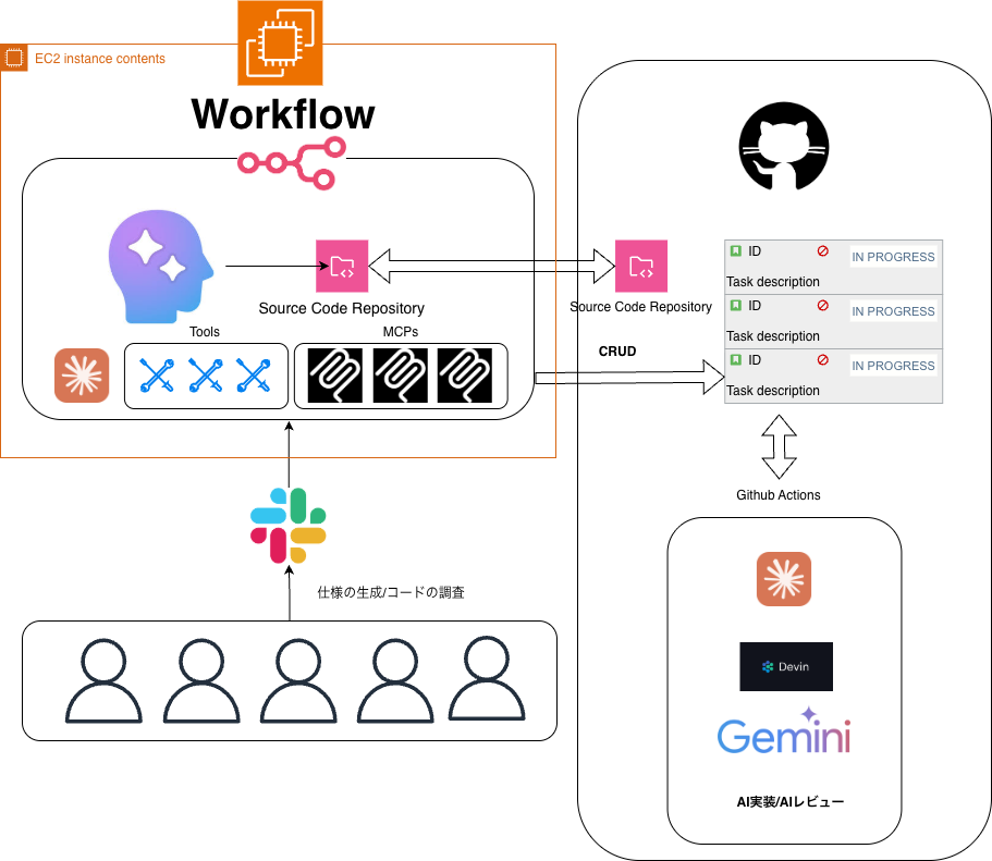 - フェーズ3 上記のコーディングが完了したら、人がPRを作成する。それをトリガーとしてAIの自動レビューが起動する(Devin、Claude Codeの2種類を使用)