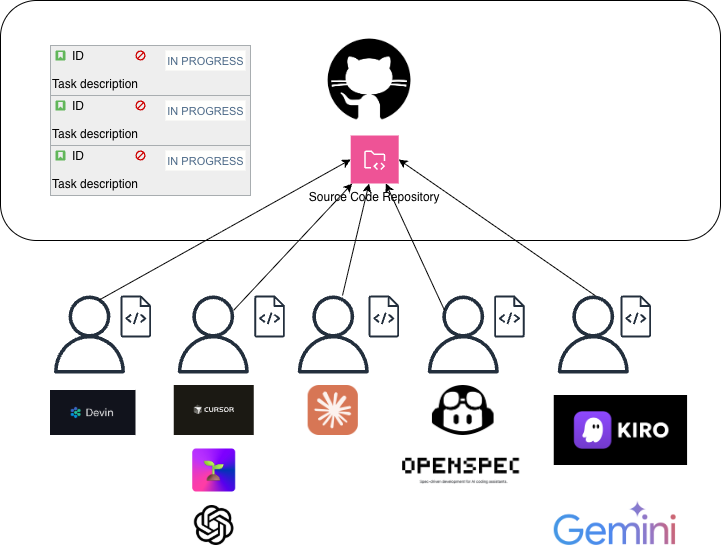 まず、ローカルツール最適化という方針について考えてみましょう。ローカルツールはあくまで人間の開発作業をAIに補助してもらうツールだと私は考えています。これをチームメンバーに適用していくとどうなるでしょうか。各開発者がローカルエージェントを使用して開発を行う様子を図示するとこちらのようになります。