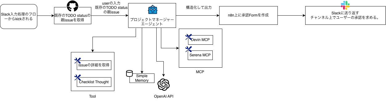 ・技術的な要はn8n。n8nの中でJavaScriptコードによる実装、Slack, Github, MCPや各種Tool、AIとの連携を行なっています。