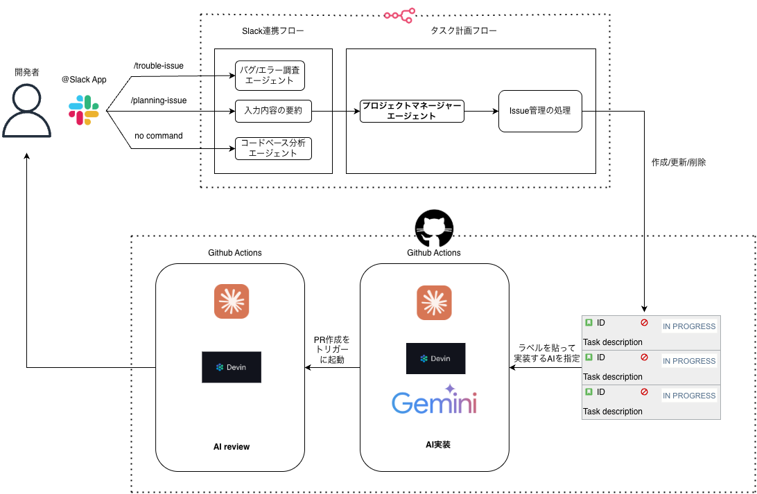 - フェーズ1 開発者がJust Ideaの状態で自由に文章をSlackに投稿する。その内容からコードベースの調査を経て、エラーの原因を調査したり、プロンプトで指定した新たな開発要件に対して、詳細な仕様を出力する。さらに開発者のapproveのアクション後に生成した仕様に対応するissueを自動的に作成し、issueのコメント部分に詳細な実装指示を書き込む。