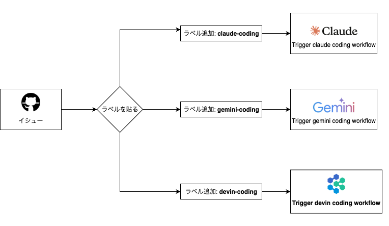- フェーズ2 issueに対して、コーディングAIエージェントの名前を冠したラベルを付与する。コーディングAIエージェントはDevin, Claude Code, Geminiの3種類を設定している。ラベルを付与することで自動的にコーディングが行われる。