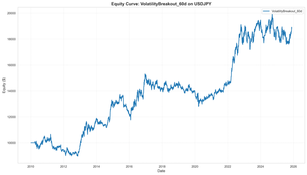 - 最高パフォーマンス: USDJPY VolatilityBreakout_60d(SR: 0.47, MaxDD: -16.5%)
