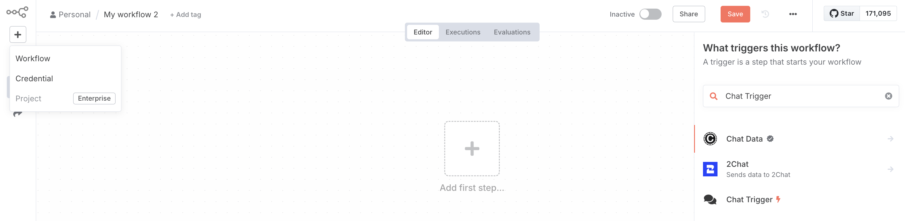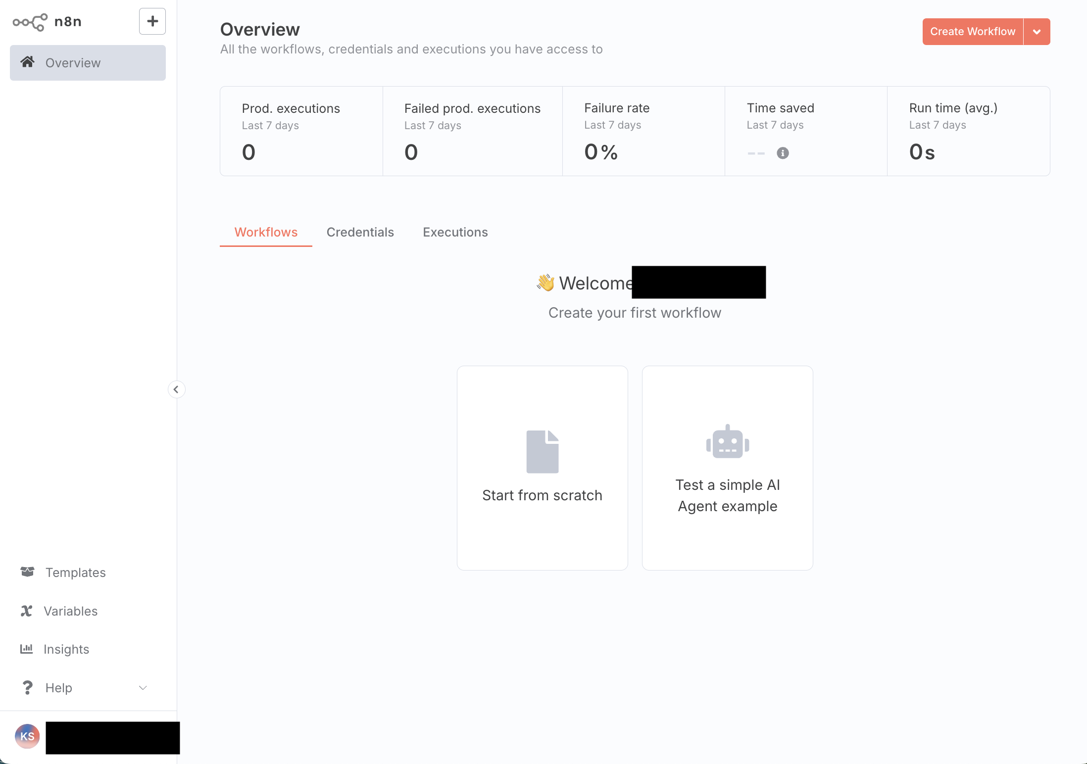 n8nを起動すると、下記のような画面が表示されます。これで、ワークフローを作成する準備が整いました。