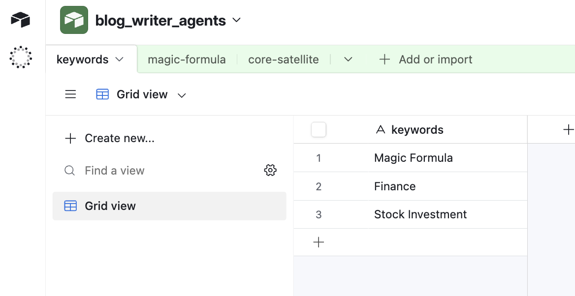 Airtableのテーブル例は下記のようになります。簡単にキーワードを追加・編集できます。Google Spreadsheetのように使えます。