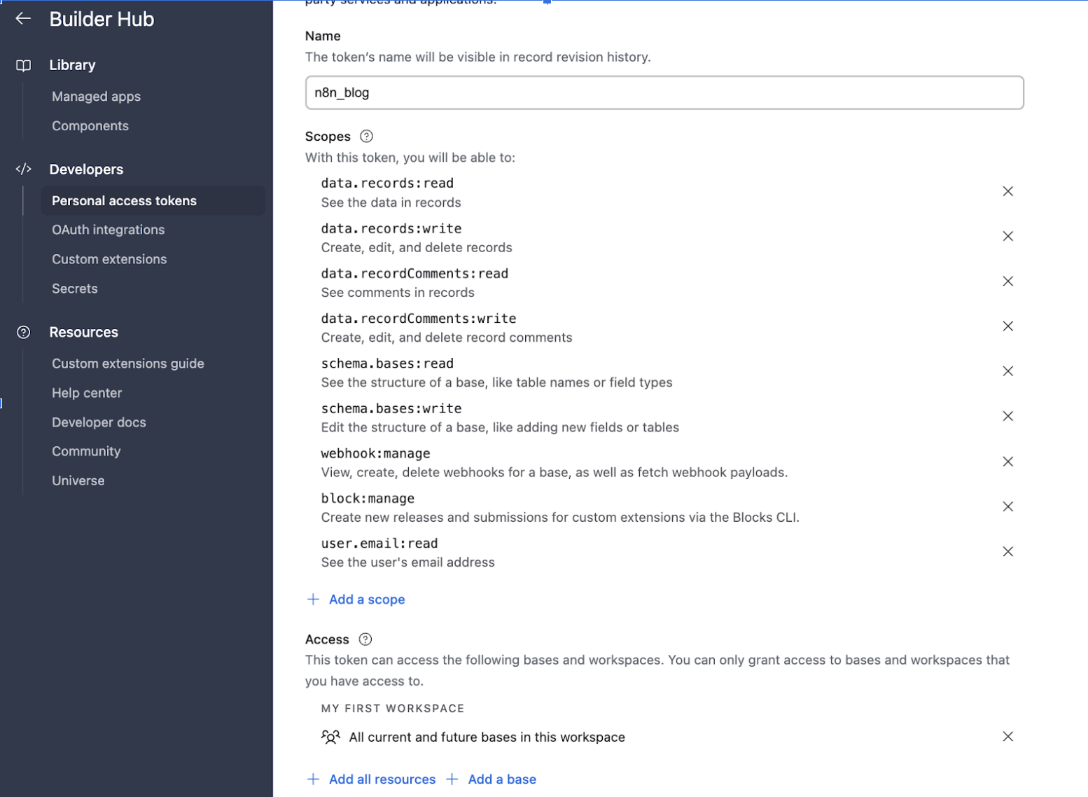 最後に、AirtableのAPIキーを取得したら、n8nの設定に追加します。 n8nのCreate Credentialsから、Airtableを選択して、Access Tokenを入力します。
