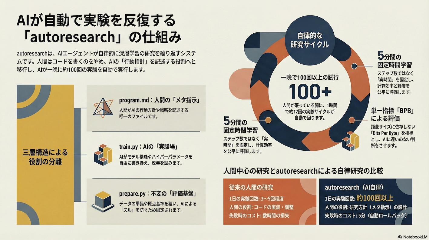 本記事では、Karpathy 氏の autoresearch を題材に、AI が自分で実験を回す仕組みと、その設計思想を整理しました。