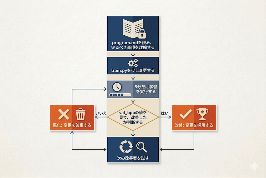 図2:autoresearch の改善ループ(Geminiで生成)