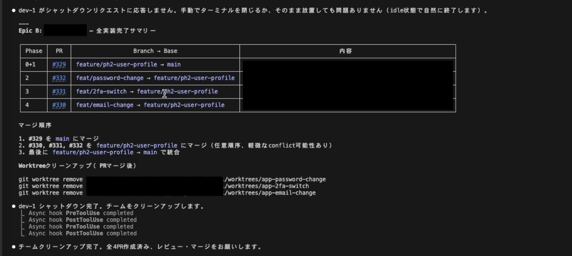 成果②:高速化。 8画面の実装が並行処理で約30分で完了し、5つのプルリクエストが全自動で作成されました。