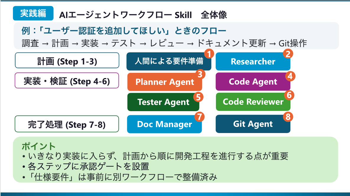 AIエージェントによるコーディング支援は急速に普及しています。しかし「AIに開発を任せる」と一口に言っても、実際にはプロンプトの書き方ひとつで結果が大きく変わり、セッションが変わればそれまでの指示もリセットされてしまいます。単発のコード生成ではなく、要件分析から設計・実装・テスト・コードレビュー・ドキュメント更新・Git操作までの開発工程全体をAIで自動化するには、もう一段階の工夫が必要です。