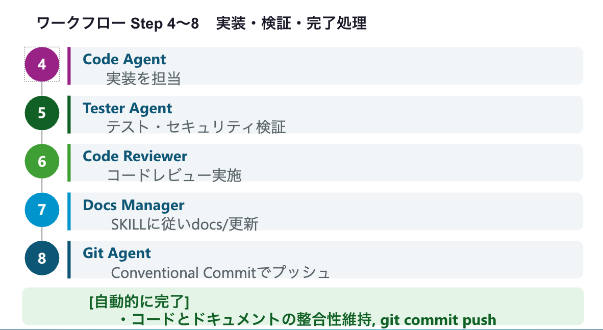 Step 7:Docs Manager AgentがSkillに従ってdocs/を更新します。コードと仕様ドキュメントの整合性をここで維持します。