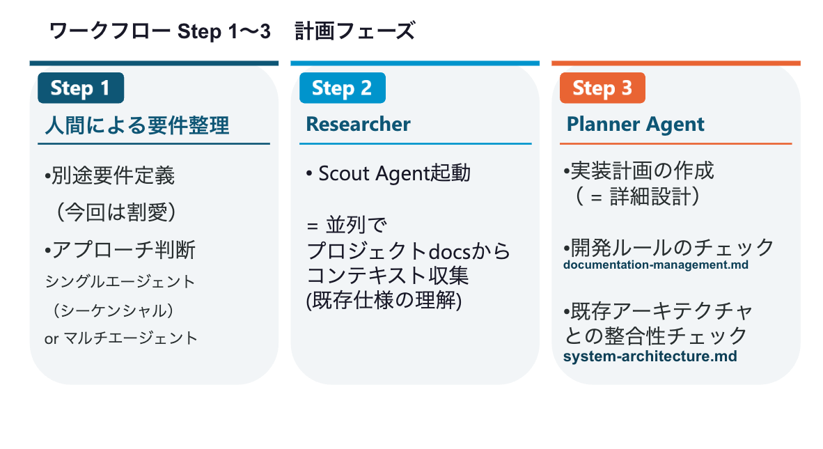 Step 3:Planner Agentが実装計画(詳細設計)を作成します。このとき、開発ルールが定義されたdocumentation-management.mdを確認し、既存アーキテクチャのsystem-architecture.mdを参照して全体との整合性をチェックした上で計画を立てます。