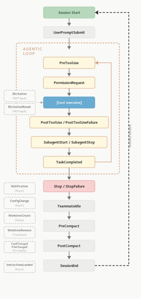 Claude Codeのセッションは上記のように構成されているようで、PreToolUseが実行されたあとにPermissionRequest(おなじみのYes, Noを選ぶ画面)が表示されます。