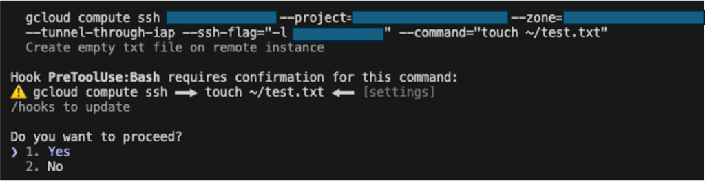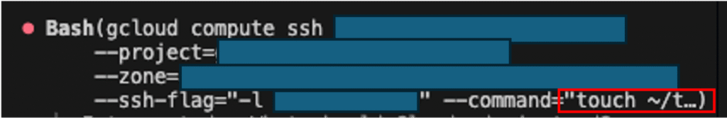 gcloud compute ssh my-vm -- ls /tmp→ 読み取りだけなので自動実行してほしいgcloud compute ssh my-vm --command="ls -la"→ これも同じく自動実行してほしいgcloud compute ssh my-vm→ インタラクティブSSHは確認を挟みたいgcloud compute ssh my-vm -- ls && rm -rf /→ チェーン攻撃は絶対に実行させたくない