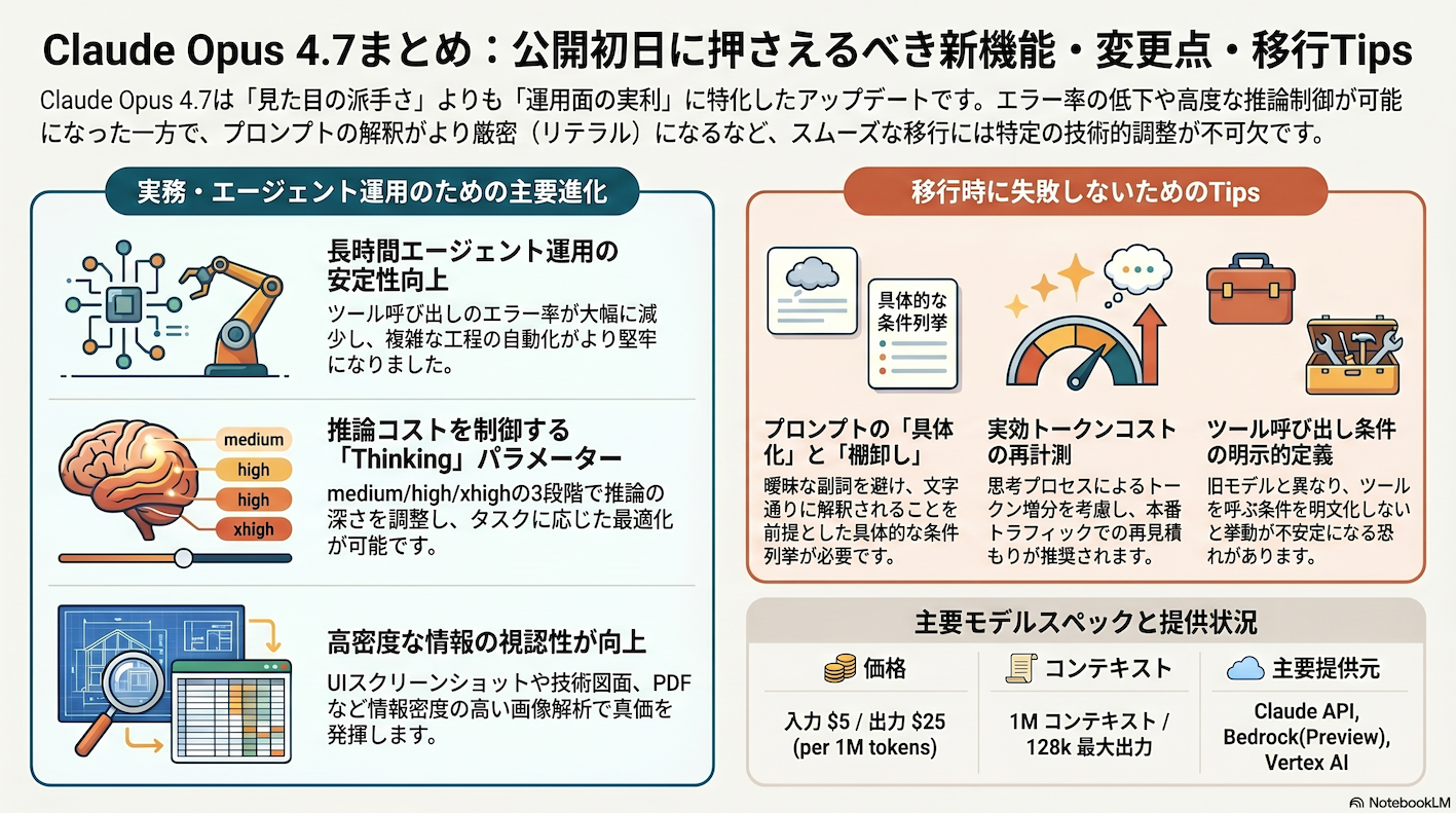 図1:Claude Opus 4.7 公開初日に押さえるべきポイントの俯瞰(NotebookLMで生成)