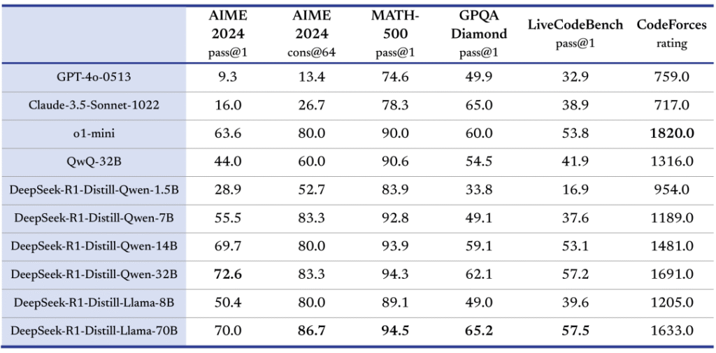 また、DeepSeek-R1を蒸留した小型モデルも同時に公開しました。これらのモデル(DeepSeek-R1-Distill-xxx)は700億から15億パラメータまでの6種類が提供されており、その性能は以下の通りです。