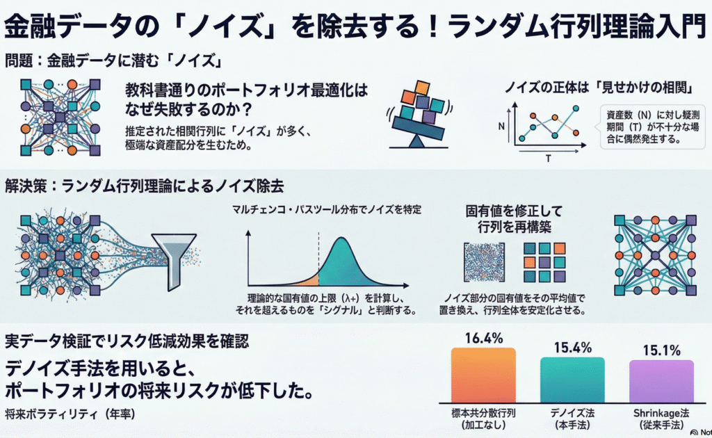 しかし、実務家はしばしば「教科書通りの最適化を行うと、極端なウェイト配分になり、将来のパフォーマンスが不安定になる」という問題に直面します。この主な原因の一つが、共分散行列に含まれる「ノイズ」です。
