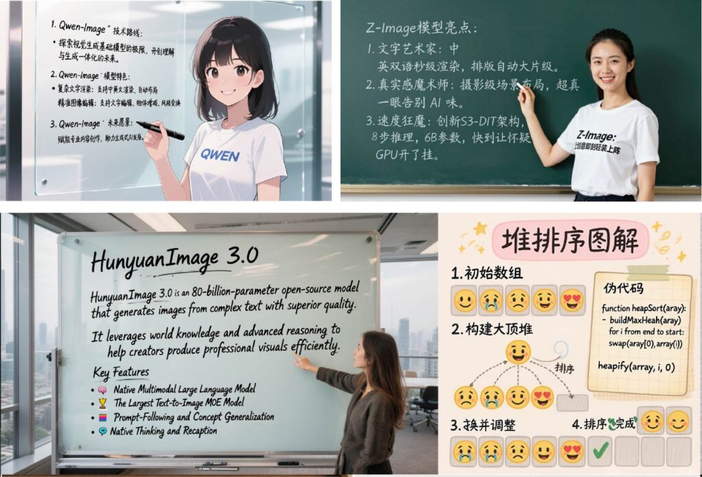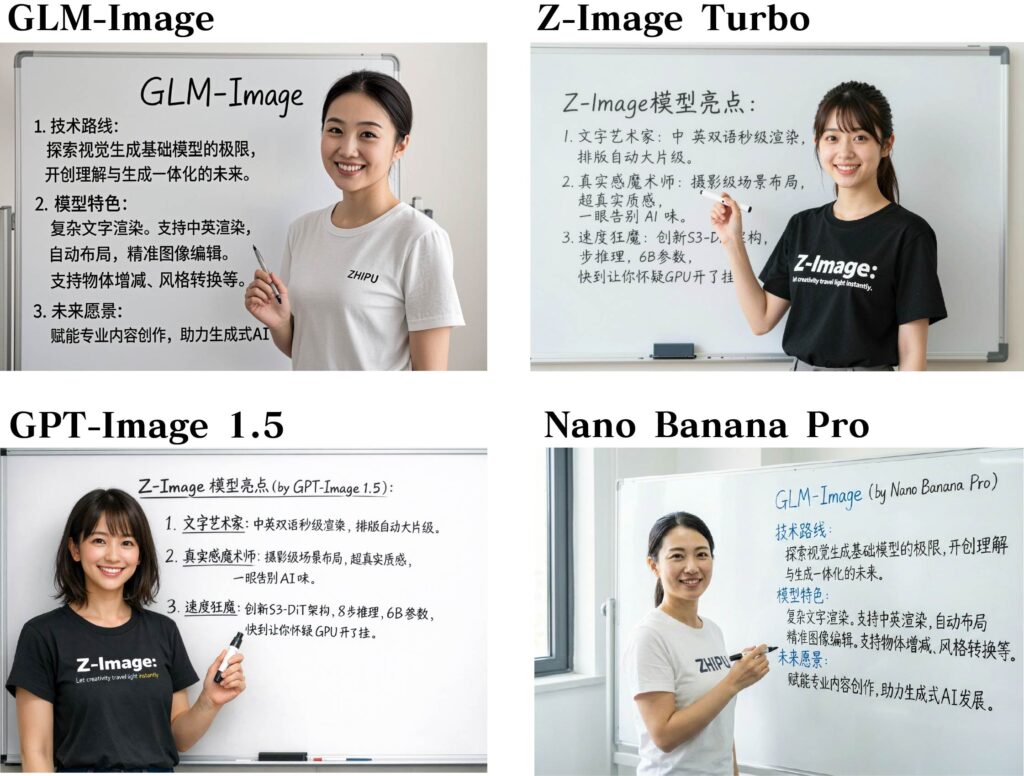 では、次にホワイトボードの文字と人物描写の比較です。GLM-Image、Z-Imageについては、それぞれのモデルの特徴を説明してもらい、GPT Image 1.5とNano Banana Proは、Z-ImageとGLM-Imageの説明を代わってもらいました。先ほどと同様にどのモデルも中国語の文字表現は問題なく(たぶん)描写できています。GLM-Imageは印刷物みたいな文字ですし、品質は先ほどと同様にクローズドモデルの方が良い印象です。Nano Banana Proがさりげなくカメラアングルが凝っていることはポイントが高いです。