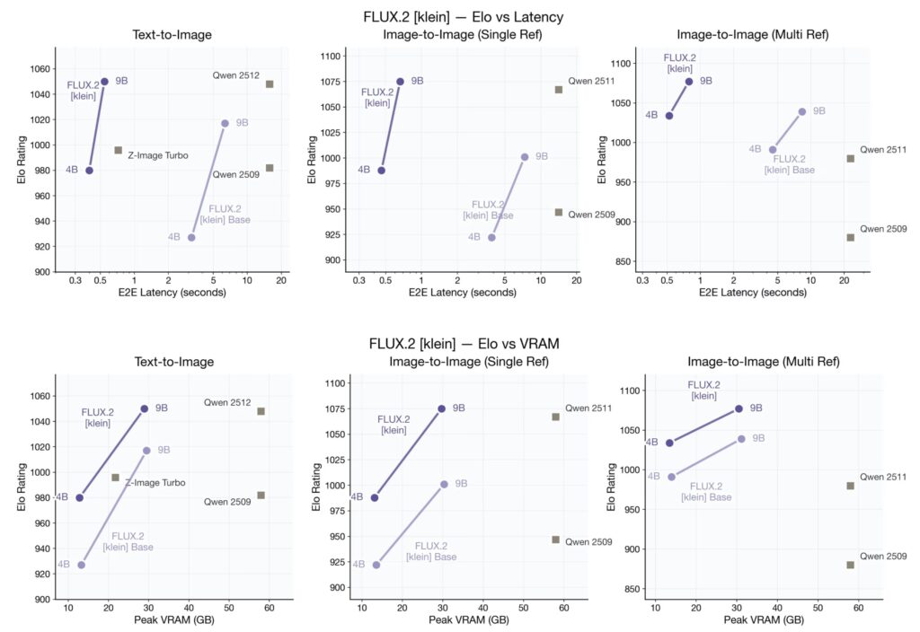 FLUX.2 [klein]のQwen-ImageやZ-Imagなどとのパフォーマンの性能比較は以下の様になります。縦軸はElo Ratingスコアで画像の品質、横軸は上段が生成時間、下段が使用メモリを表しています。FLUX.2 [klein]は、画像生成はほぼ同等でありながら圧倒的な生成速度と低メモリ使用量を実現しています。