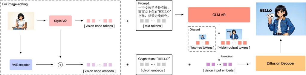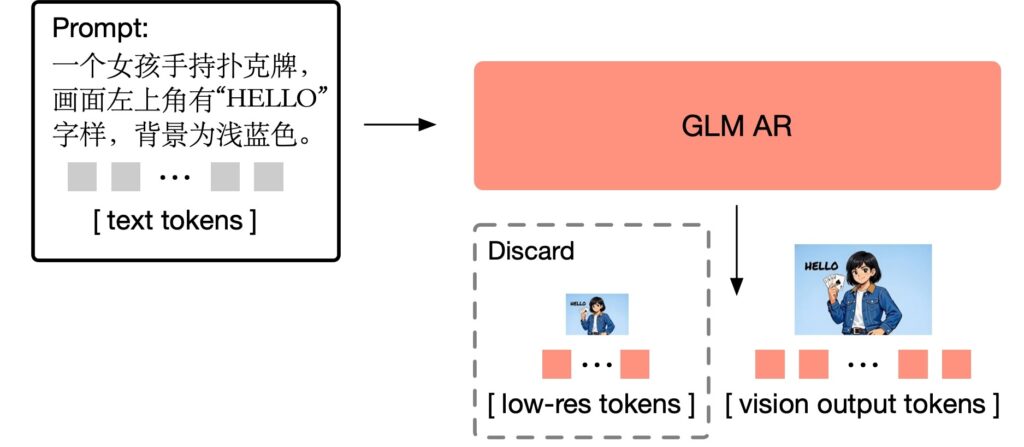 - 自己回帰ジェネレーター:GLM-4-9B-0414ベースの9Bパラメータのモジュール。プロンプトをもとに画像生成のための1,000-4,000トークンのヴィジョントークンを生成