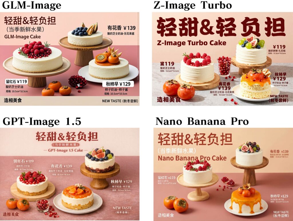 まずは、文字表現の比較です。ポスターを生成してみました(元ネタはZ-Imageの論文)。文字は中国語ですが、どのモデルもそつなく描写できています。描写される文字の品質に順番をつけるならば、GPT Image 1.5が最もよく、次にNano Banana Pro、Z-Image Turbo、GLM-Imageの順でしょうか、個人的な感想ですが。