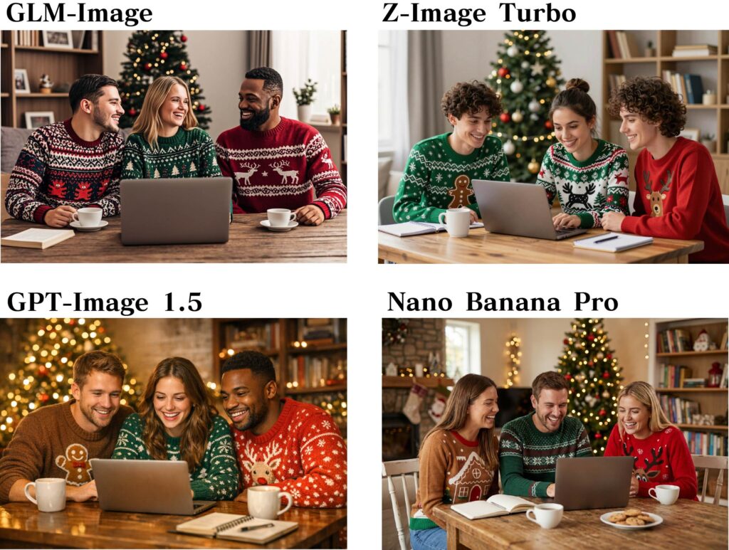次に人物描写の比較をしてみます。これに関しては、三人の人物がクリスマスシーズンの風景の中で談笑している様子を描写してもらいました。まあ、大体良い感じではないでしょうか?ただ、GLM-Imageは比較してみると、画面全体が黒っぽい印象があります。先ほどのポスターやホワイトボードの画像でも同様でした。
