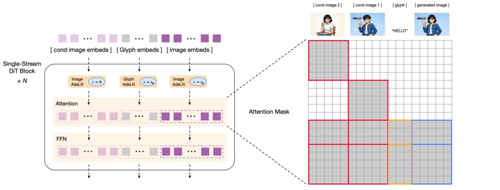 次に拡散モデル部分は、CogView4をベースとしています。CogView4はDiT(Diffusion Transformer)採用した7Bパラメータの画像生成モデルであり、拡散モデルと言っていますが、昨今の画像生成AIのデファクトスタンダードであるFlow matchingのモデルです。入力には、自己回帰モデルからの埋め込みと、Image-to-Imageの場合では入力画像の特徴量を与えます。また、文字表現を強化するために、字形表現(glyph embeds)も入力に加えられています。これは以前にBlogで紹介したGlyph-byT5を参考にしているようです(GPT-4oの中身(予想)とGlyph-ByT5〜文字の画像生成への挑戦〜)。