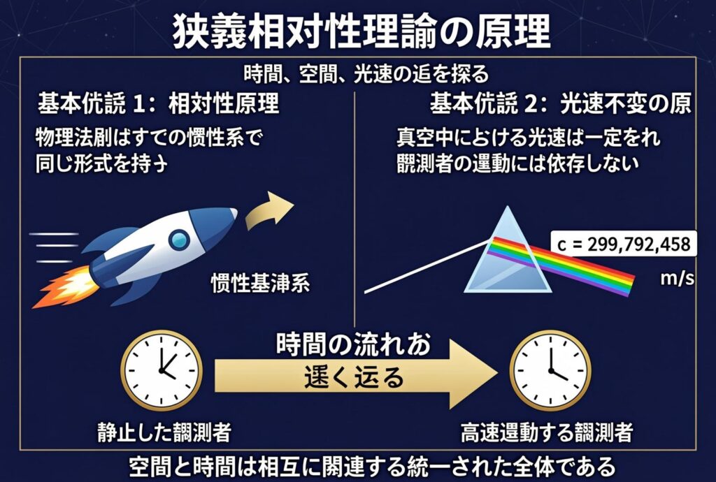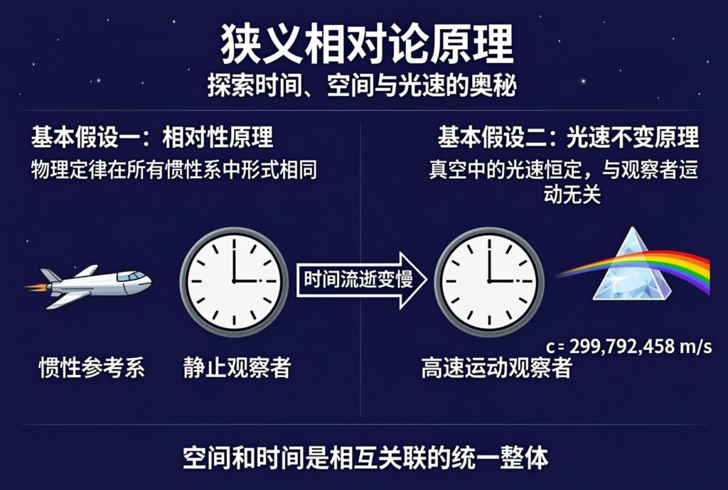 一幅采用现代科学设计风格的狭义相对论原理信息图,背景为深邃的深蓝色,装饰有淡金色的几何网格与星光线条,营造出科技感与理性的学术氛围。画面顶部中央以醒目的白色粗体无衬线字体呈现主标题“狭义相对论原理”,下方搭配浅灰色小字副标题“探索时间、空间与光速的奥秘”。主体部分分为左右两个主要板块,左侧板块顶部文字为“基本假设一:相对性原理”,下方配有文字说明“物理定律在所有惯性系中形式相同”,旁边绘制有匀速运动的飞船图标,标注文字“惯性参考系”。右侧板块顶部文字为“基本假设二:光速不变原理”,下方说明文字为“真空中的光速恒定,与观察者运动无关”,配有一束光穿过棱镜的矢量图,并在旁边醒目列出公式“c = 299,792,458 m/s”。画面中央通过对比图展示“钟慢效应”,左侧为静止的时钟,标注文字“静止观察者”,右侧为高速运动的时钟,指针走得更慢,标注文字“高速运动观察者”,中间用箭头连接并写有说明“时间流逝变慢”。底部印有总结性标语“空间和时间是相互关联的统一整体”。整体视觉风格扁平化,配色以深蓝、白、金为主,文字清晰锐利,布局逻辑严密。