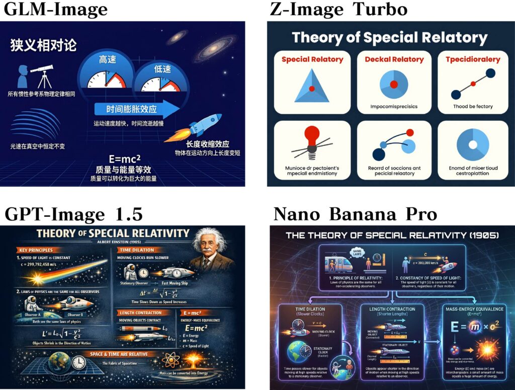 最後にインフォグラフィックを描写してもらいました。これはGLM-4.7の利用によるプロンプトの拡張(prompt_utils.py)は使わずに、単純に「特殊相対性理論のインフォグラフィック」というシンプルなプロンプトを与えています。GLM-ImageやZ-Image Turboでも組み込まれているLLMの知識を利用していますが、9Bと4Bの差が出たのか、GLM-Imageは良いのですが、Z-Image Turboは訳の分からない絵になってしまいました。GPT-Image 1.5とNano Banana Proは複雑な情報をまとめてくれていますが、細かい式など一部不可解な部分もあります。