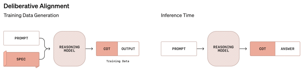 さて、最後になりましたが、OpenAIの推論モデルでは、以前にもブログで紹介したdeliberative alignment(熟考的アライメント)という技術を利用しています(OpenAI o1 pro mode でデータ分析してみた〜「Deliberative Alignment」による推論能力と安全性の強化〜 )。これはポリシーに準拠した仕様(SPEC)を入力で一緒に与えて、Chain-of-Thought(COT)と出力(Output)を学習データとしてチューニングする手法で、OpenAI o1などのモデルで採用されている強化学習手法の一つです。この熟考的アライメントを通じて、o1では推論能力と安全性の向上が報告されています。