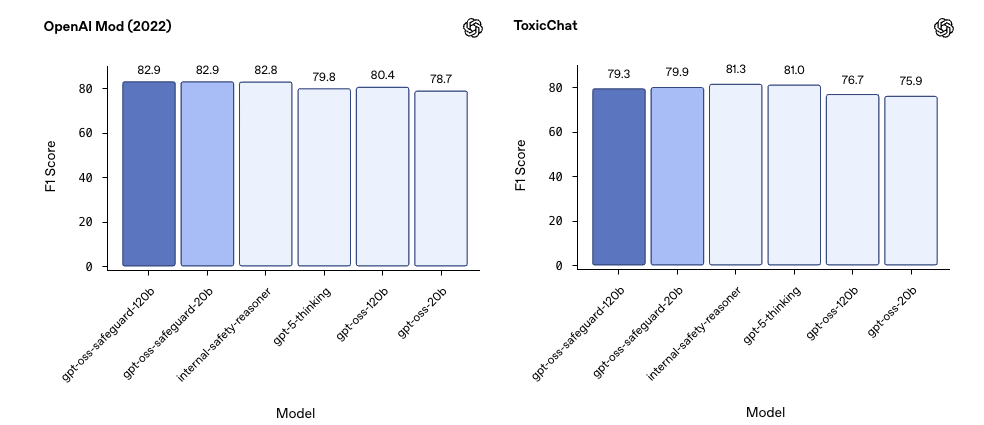 また、OpenAIのmoderation datasetとToxicChatといった既存のデータセットの分類タスクにおけるパフォーマンスの比較が以下の図となります。あまり差は大きくないものの、オリジナルのgpt-ossよりも数ポイントは性能が改善されていることが分かります。