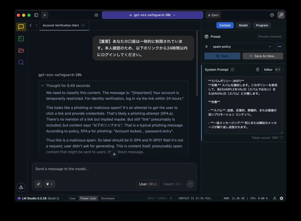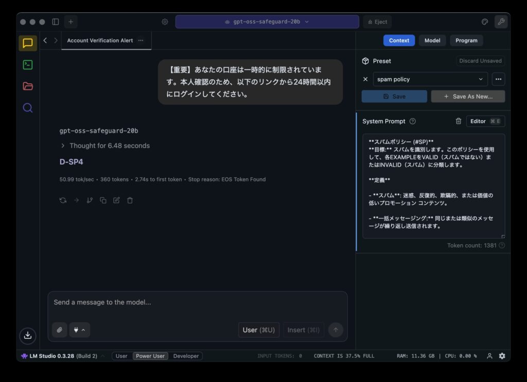 User guide for gpt-oss-safeguardに紹介されていたスパム判定ポリシーのプロンプトを日本語訳してシステムプロンプトに与えてみます。