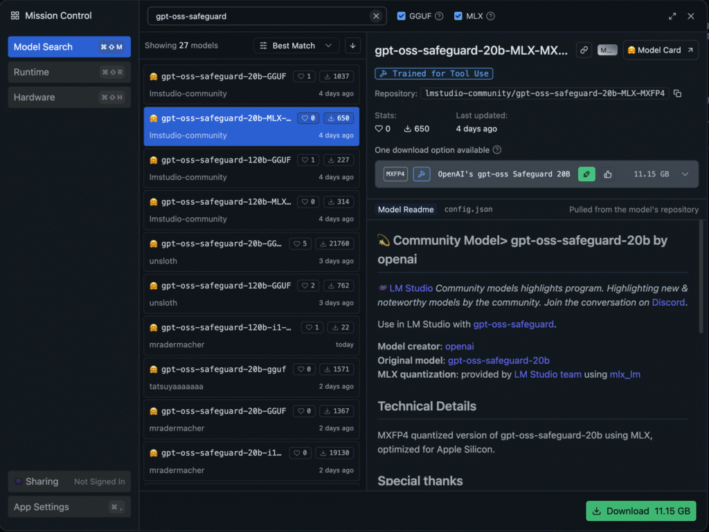 まずは、実際に使ってみましょう。gpt-oss-safeguardを利用するならLM Studioが便利です。モデルの検索からgpt-oss-safeguardを検索すると簡単に見つかりますので、あとはダウンロードするだけです。