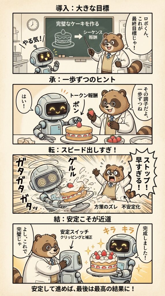 元々のアブストをよく読むと、シーケンス報酬がケーキ全体の比喩で、トークン報酬がケーキを構成する一部(いちごなど)であるということ等すこしずつ漫画の意味が理解できるようになってきますが、これでは本末転倒ですね笑