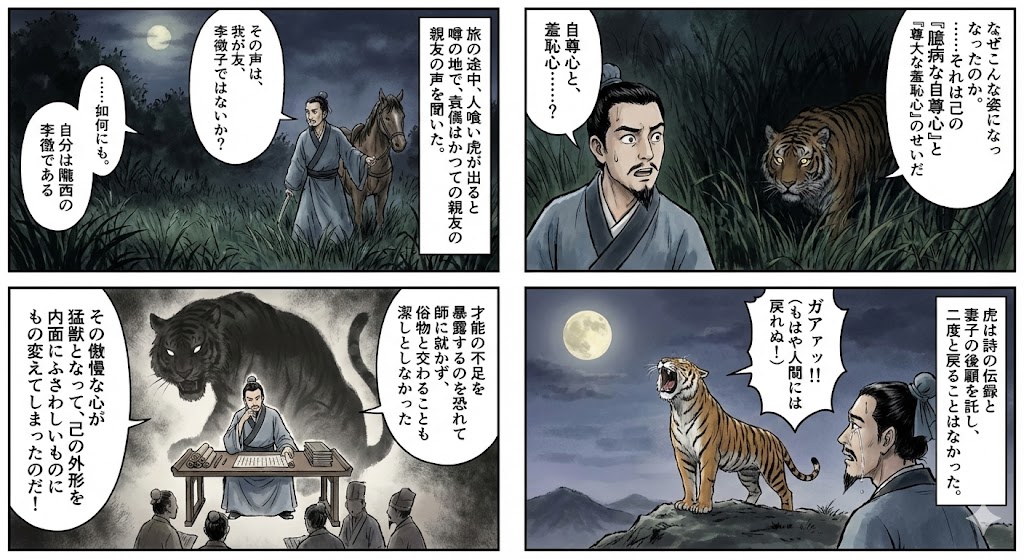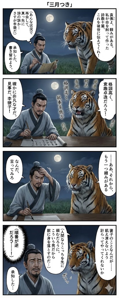 厳密には李陵は話の序盤で「段々と人間から虎に変わった際の具体的な経緯」を延々と話すので、詩の話をいきなり始めたわけではないことや(順番が逆だろう、、、)というツッコミは後付けのメタ的な視点であるという物語の二次創作?が行われていますが、