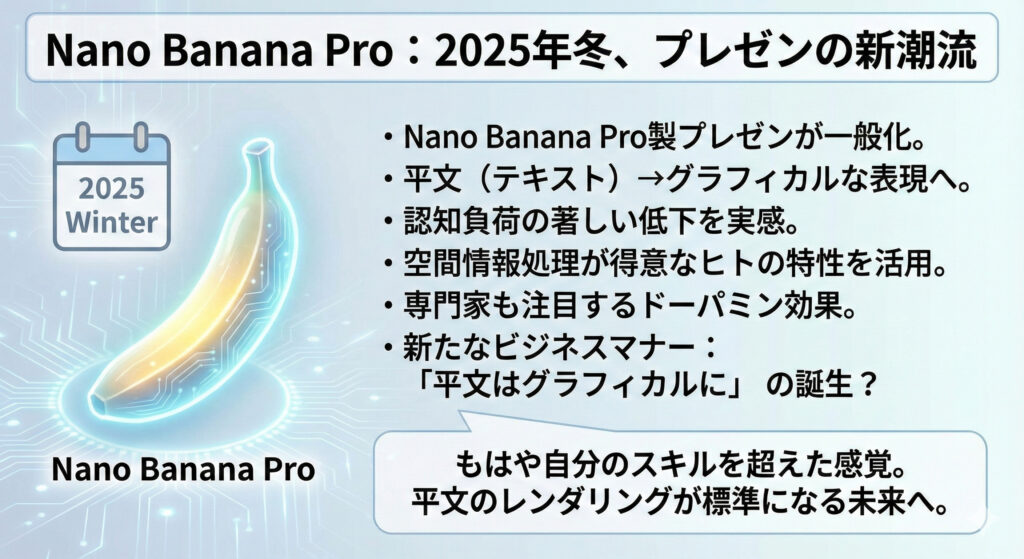 Nano Banana Proで作成されたプレゼンが巷に溢れ始めている2025年の冬ですが、皆さんもお試ししたでしょうか?