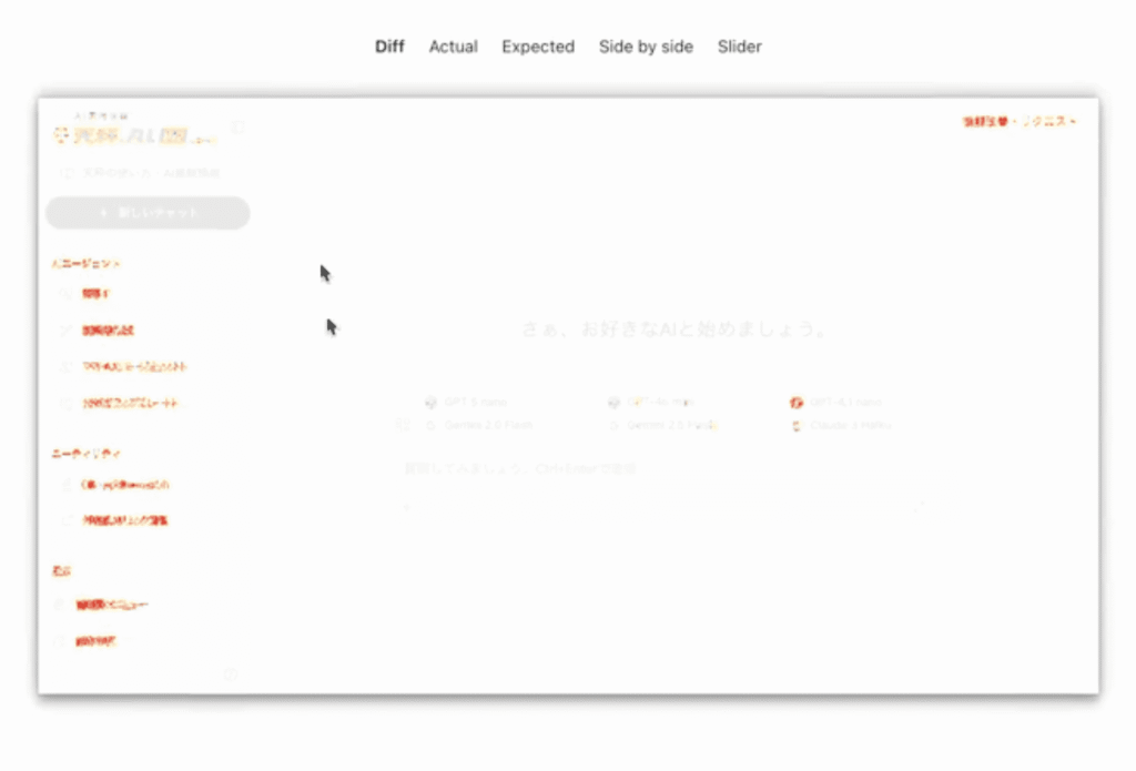 Visual Regressionテストの結果についてですが、diffを行い、違いが出ていくるので、思ってもみない箇所を触ってしまって、へんな修正が入っていないかなどチェックできます。
