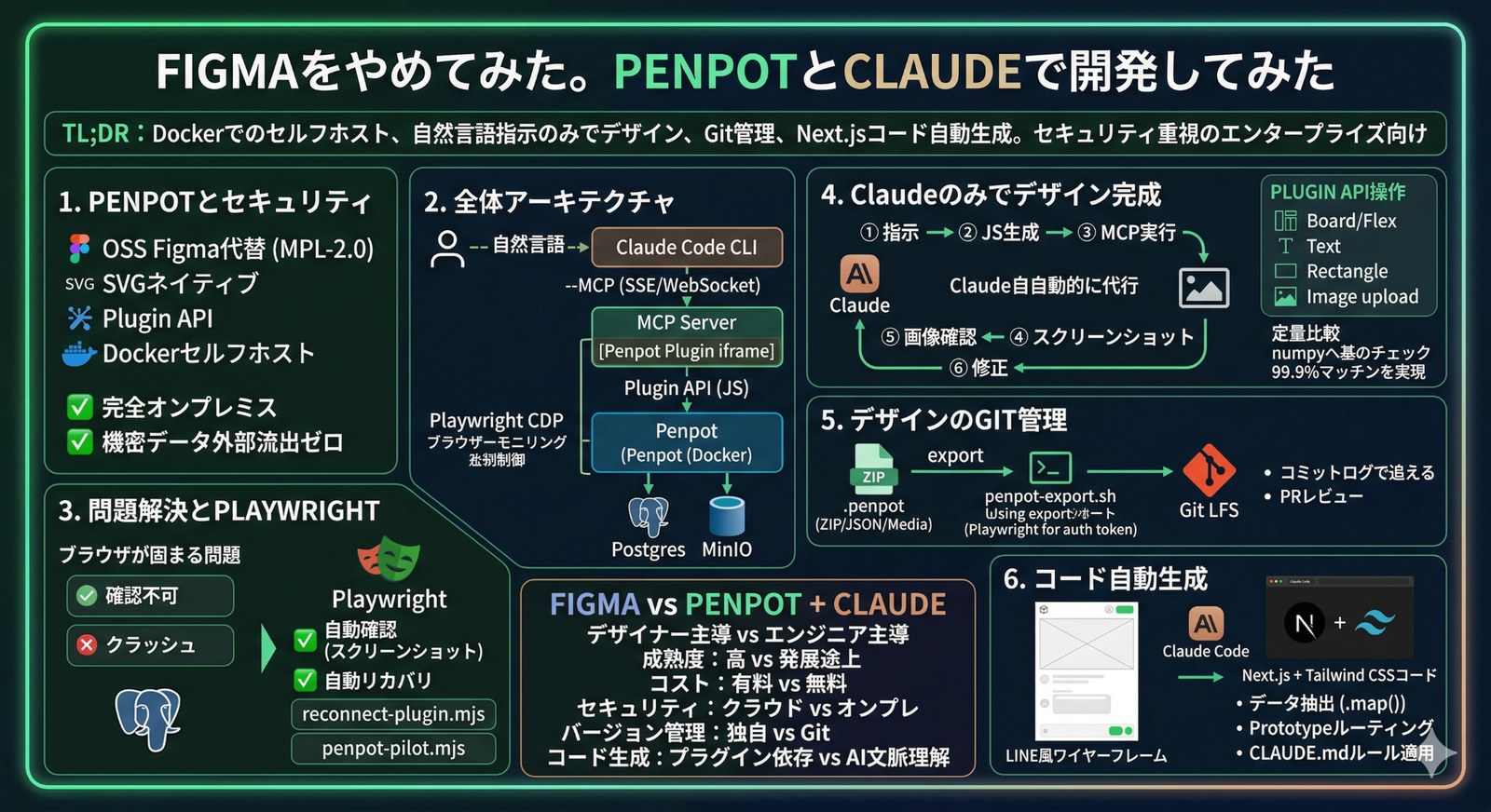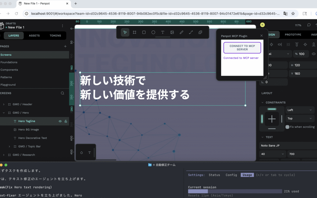 - Playwrightによるブラウザ自動制御: MCP接続の切断やPenpotのクラッシュから自動復旧。スクリーンショットによるデザイン確認も自動化